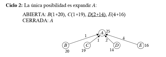 Ciclo 8: El nodo más prometedor de ABIERTA es Z, que es seleccionado para su expansión. ABIERTA: B (1+20) CERRADA: A, D, E, F, C, G, Z Al ser Z un nodo meta, finaliza el algoritmo. El camino encontrado es A → C → G → Z.